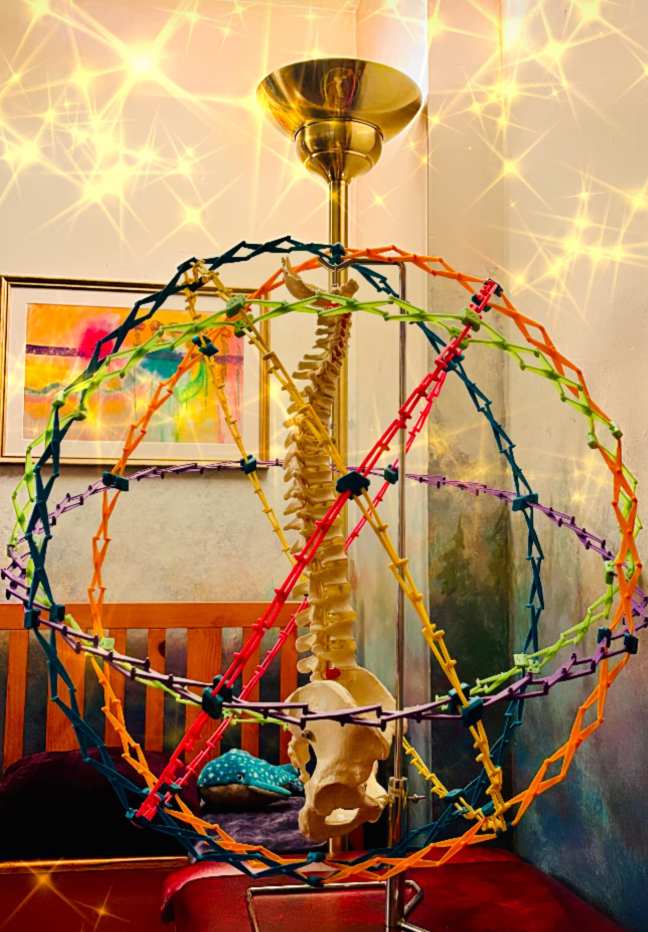 For on the other side of the “cage” of where I was sitting, I see myself now standing and walking within a GOLD Christed Light Geometric Sphere that surrounds me and IS expanding, as if to be the spherical border of my auric field. The vision I received was much like this expanded rainbow Hoberman Ball, yet much larger, expanding ABOVE and BEYOND my physical body in ALL directions. I could see this GOLD sphere had a geometric configuration, very similar to the ball in the photo. Smooth GOLD lines with connecting points spaced out periodically that have some sort of “bridging” quality to them